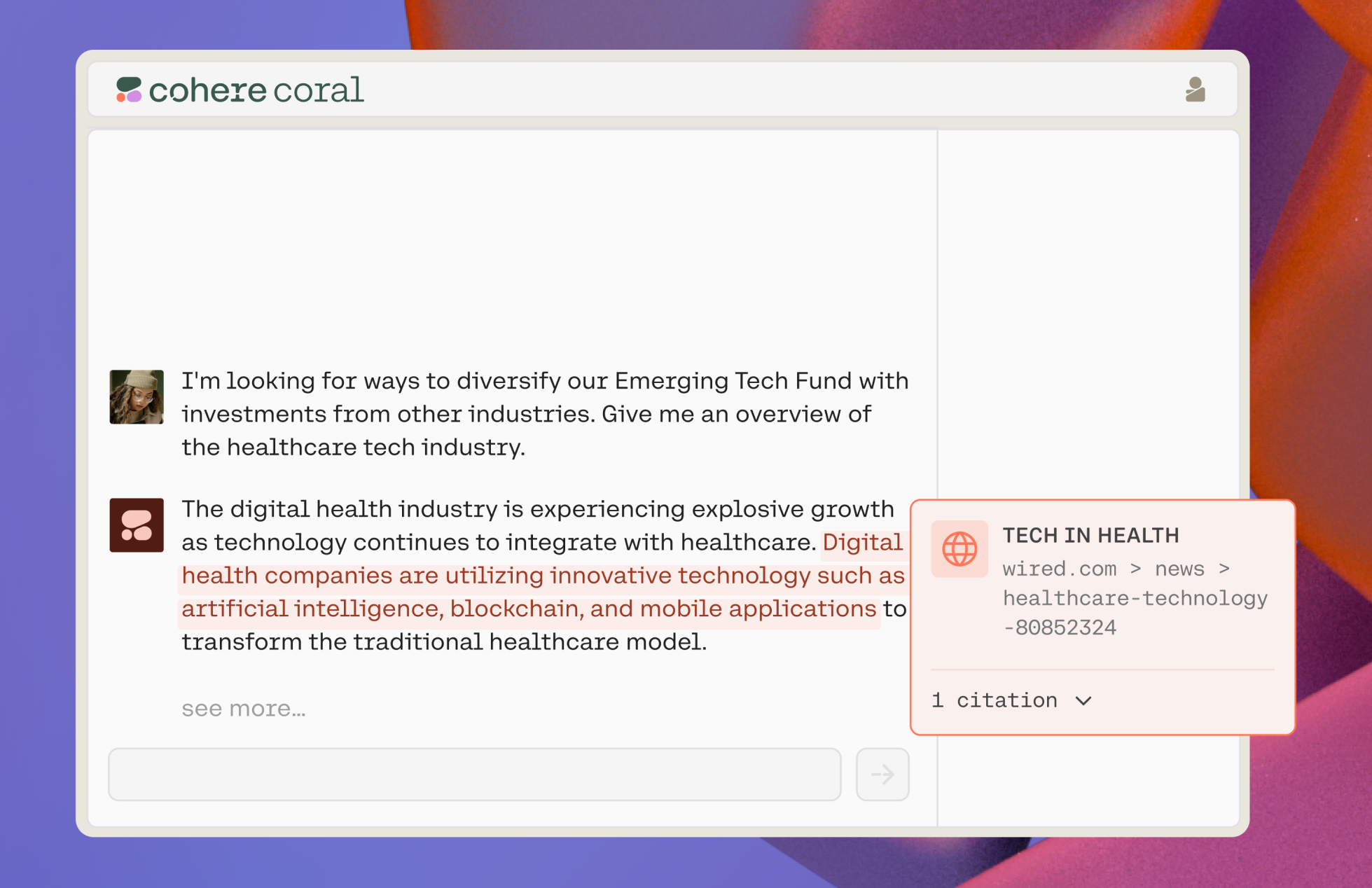 Coral is a knowledge assistant that helps enterprises supercharge the productivity of their most strategic teams. Coral is powered by Cohere’s Command model, trained with chat, reasoning, and writing abilities.