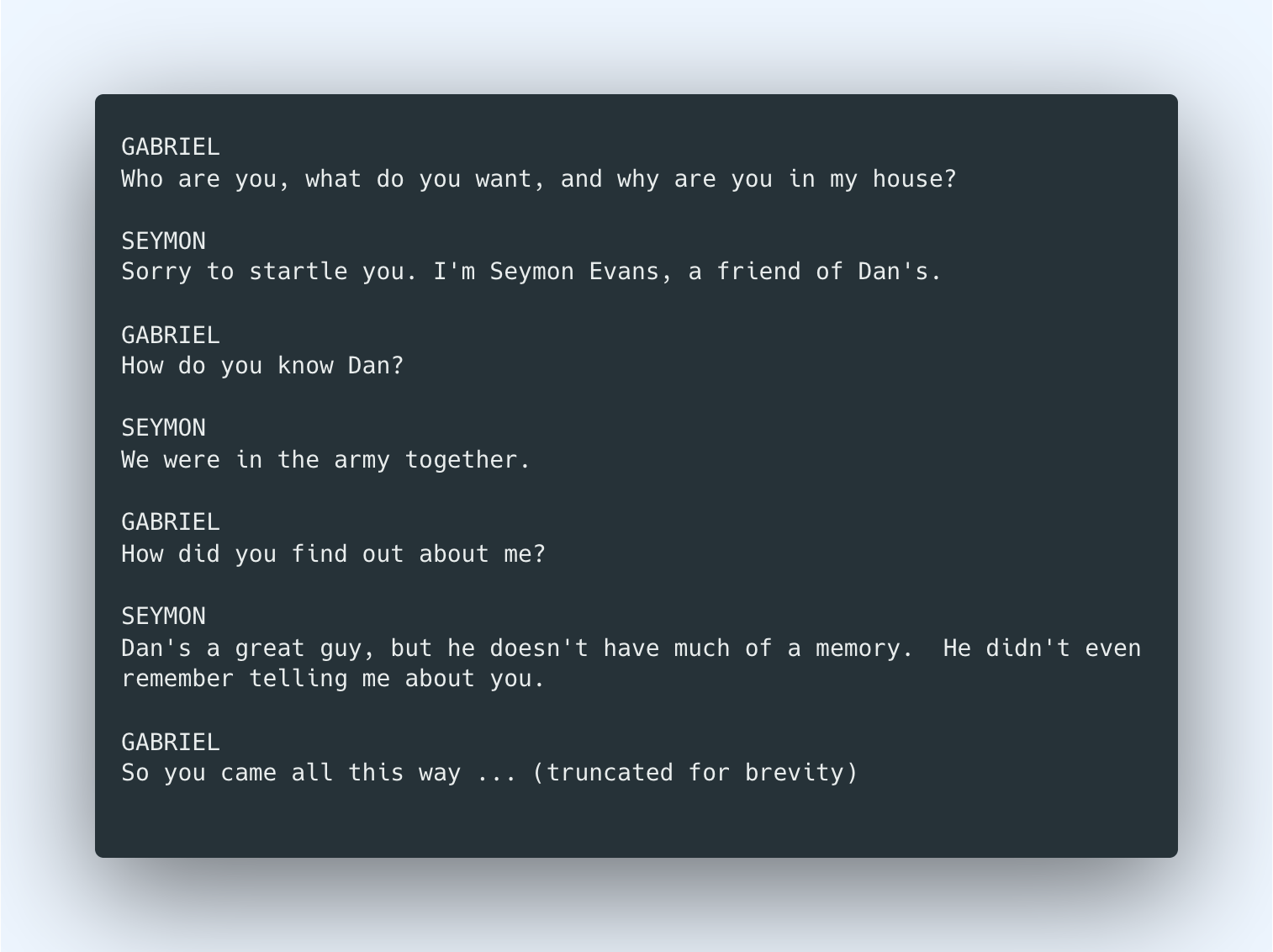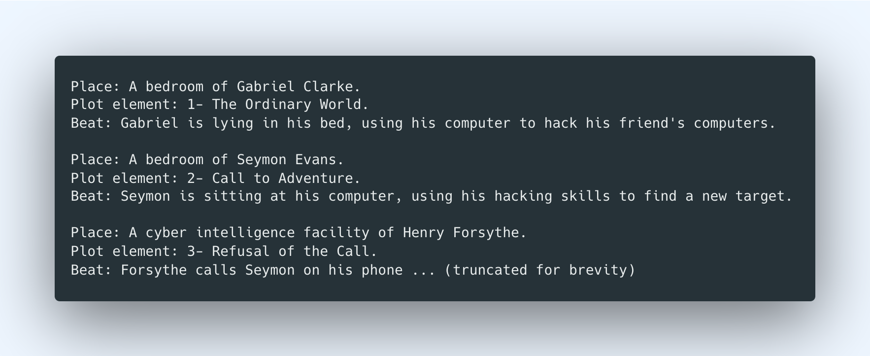 And that’s it! We have generated the dialog for the whole story, progressing through the narrative structure over six story beats.