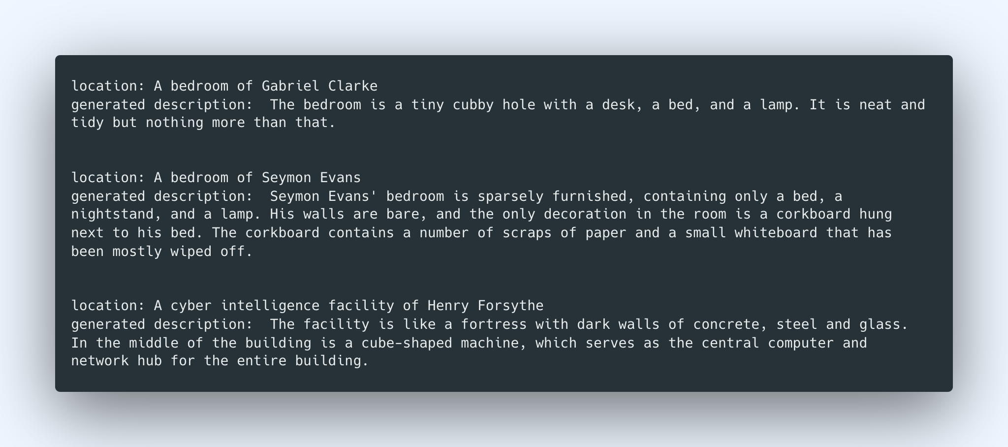 Recall that in the previous step, we have already generated the locations where each beat takes place. But having more descriptive location descriptions that are more expansive and detailed can go a long way to providing a good context to the dialog generation step (next step). So let’s now add these to our log line.