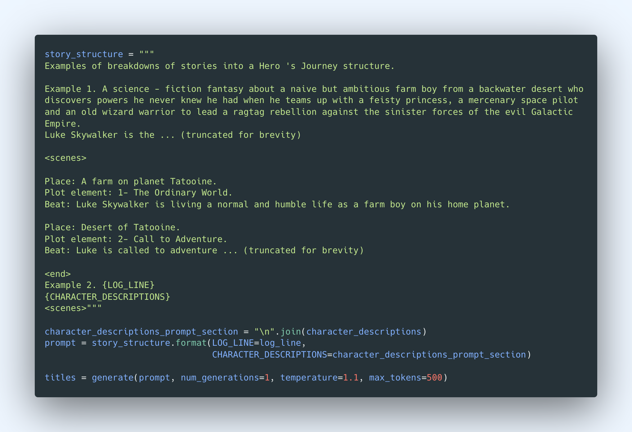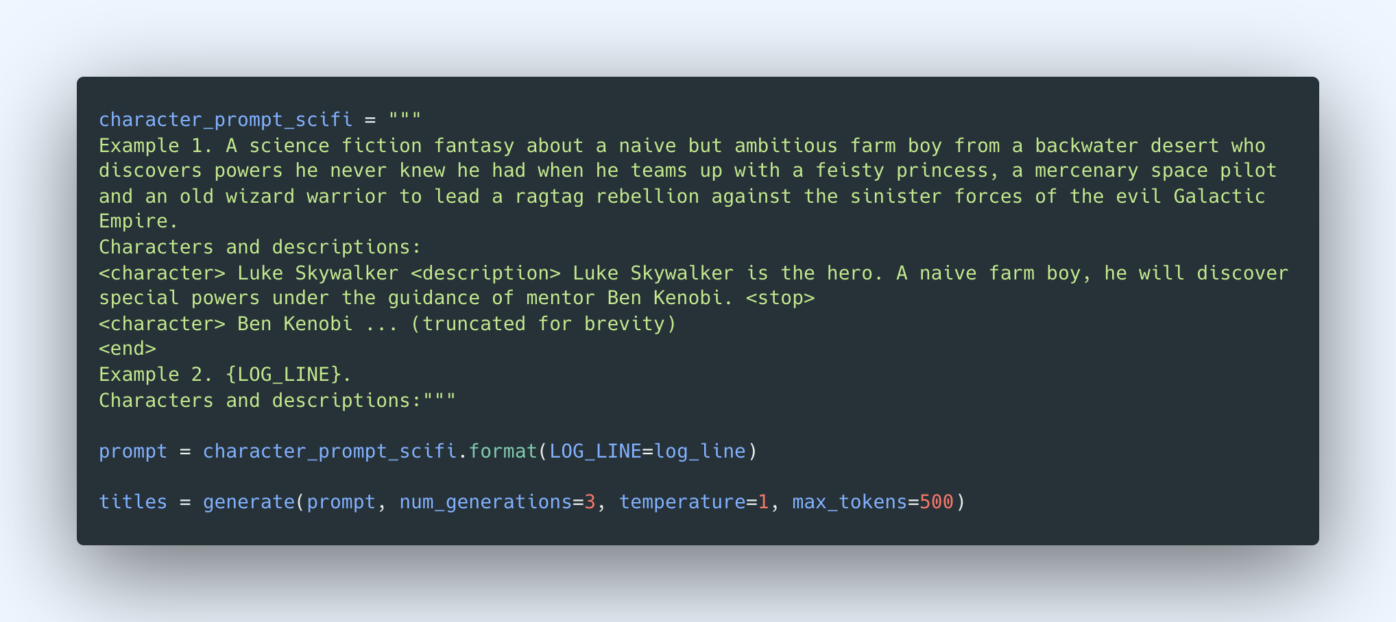 To do this, we create a prompt to the base model consisting of one example of a summary and the associated character descriptions (we use the Star Wars movie). To complete the prompt, we append the story summary that we’ve created earlier. This story summary makes up the first entry to our log line, which we’ll keep on adding to as we progress.