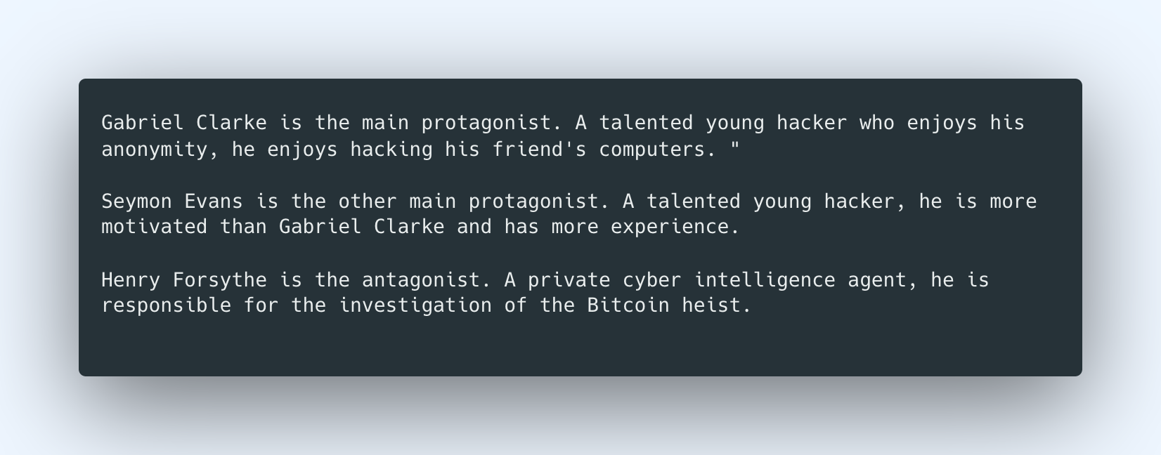 Now that the title part is done, let’s move on to the main path of our story generation, which eventually ends with the screenplay dialog generation. Here is where we take a step-by-step approach, starting with the characters in the story. We’ll generate a few characters and create descriptions for each of them.