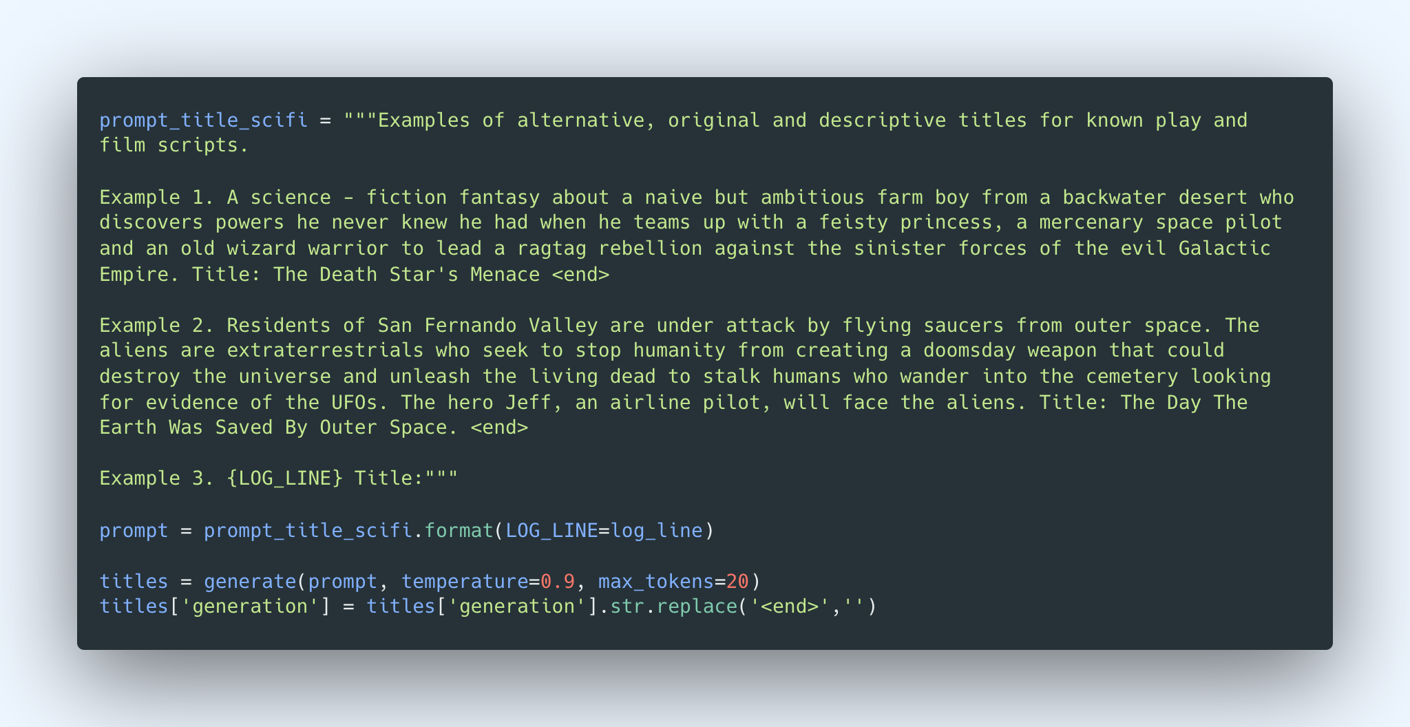 The prompt contains two examples of a summary and its corresponding title, which is then appended with the summary we created.