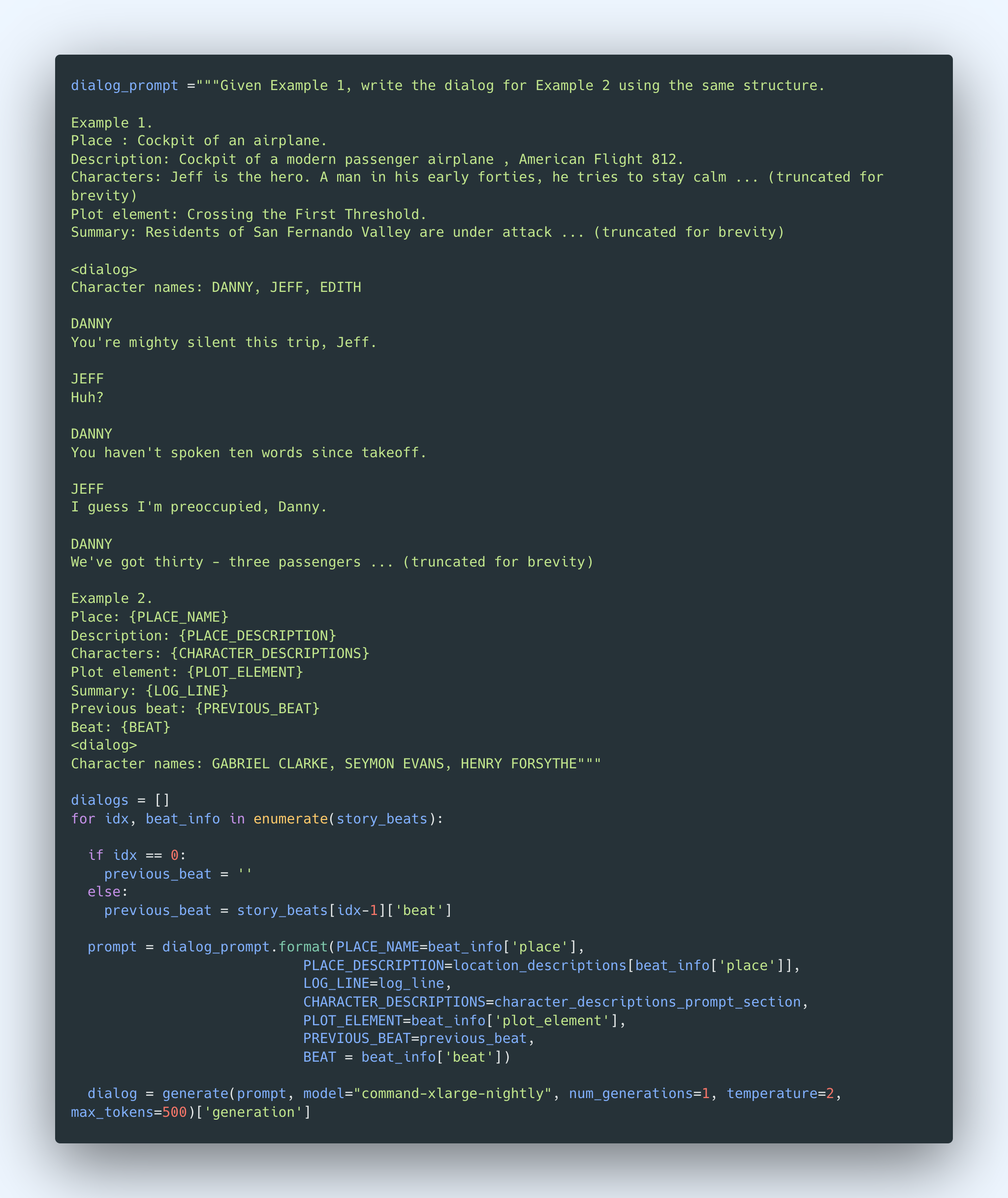 We create a prompt for the model for generating the location. For each story beat, we start with an instruction (“Given Example 1, write the dialog for Example 2 using the same structure”) and provide one example consisting of the place, location description, character descriptions, plot element, summary, the previous beat, the current beat, and the screenplay dialog for the current beat.