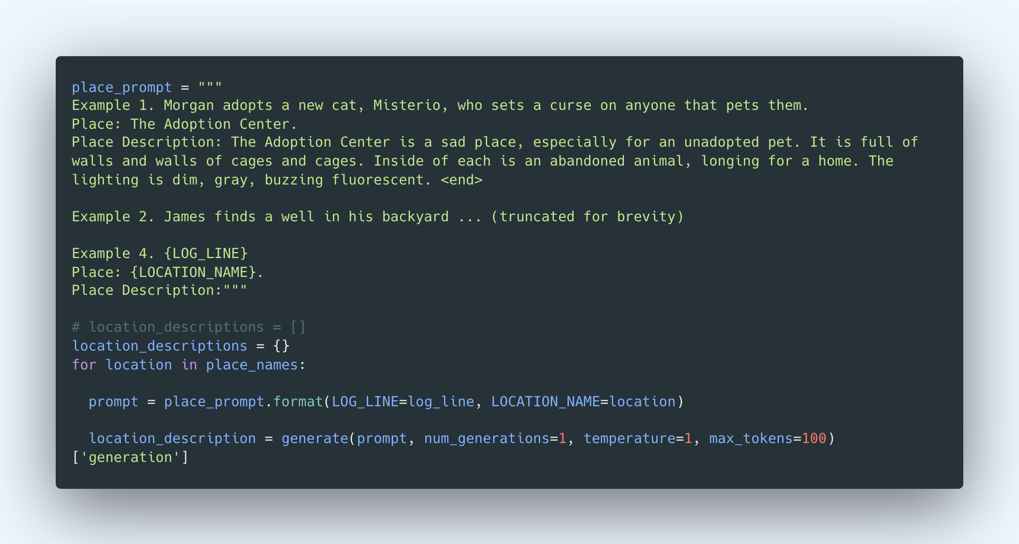 We know the drill by now. We create a prompt for the base model to generate the location descriptions. Here we provide a few examples of a context, location, and the location description. Then we append our current log line to the prompt. Finally, we generate the new location descriptions by iterating over the list of places we generated in the previous step.