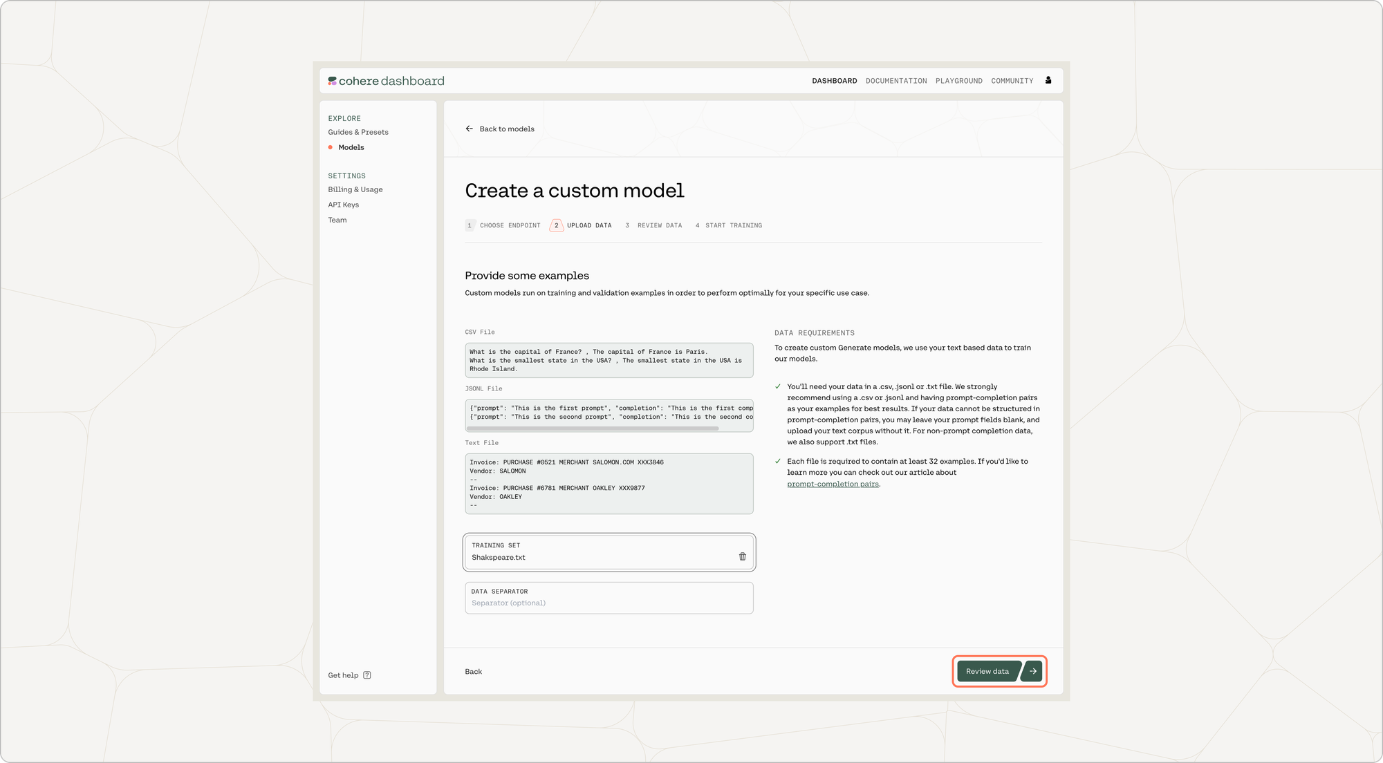 file with prompt completion examples, and you can upload it by going to ‘Training data’ and clicking on the upload file button.