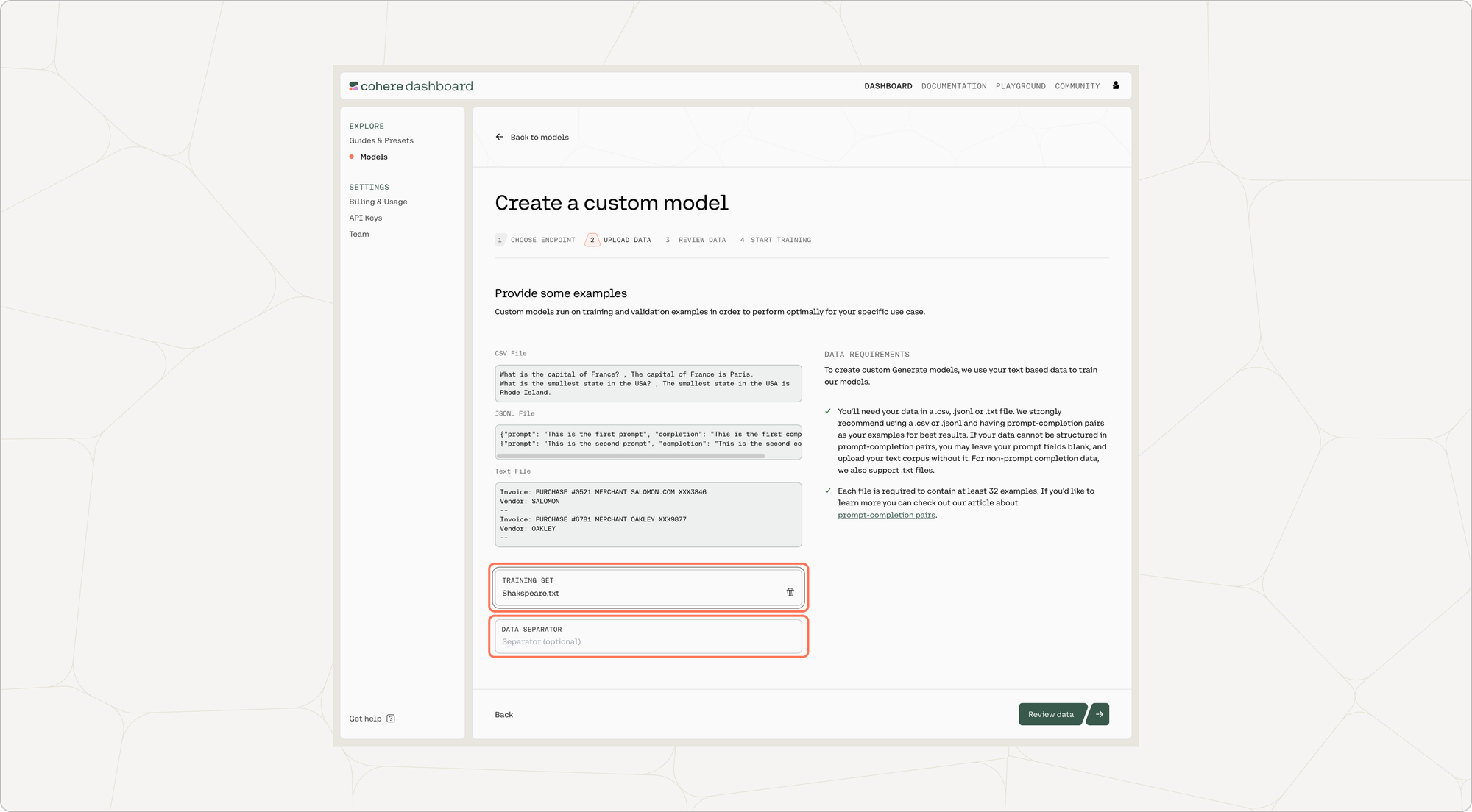 Your data should be in a .csv or .jsonl file with prompt completion examples, and you can upload it by going to ‘Training data’ and clicking on the upload file button.