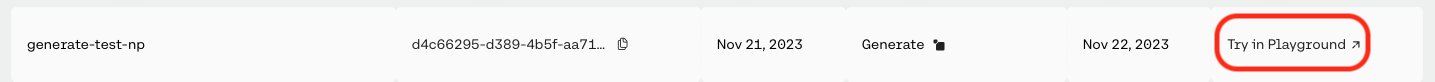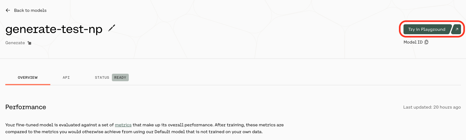 Once your model completes training, you can call it by selecting ‘Try in Playground’ from the model list view: