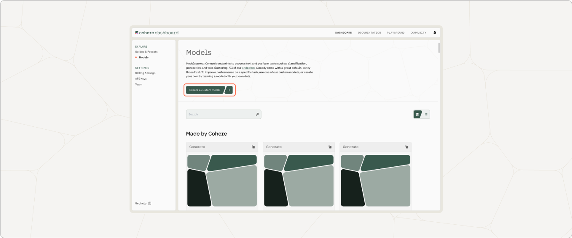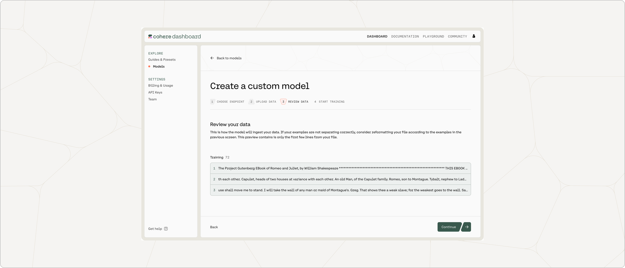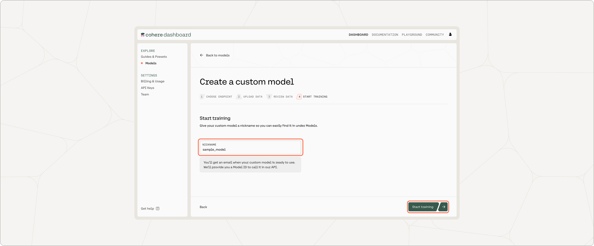 Creating a fine-tuned generative model via the Dashboard consists of a few simple steps, which we’ll walk through now.