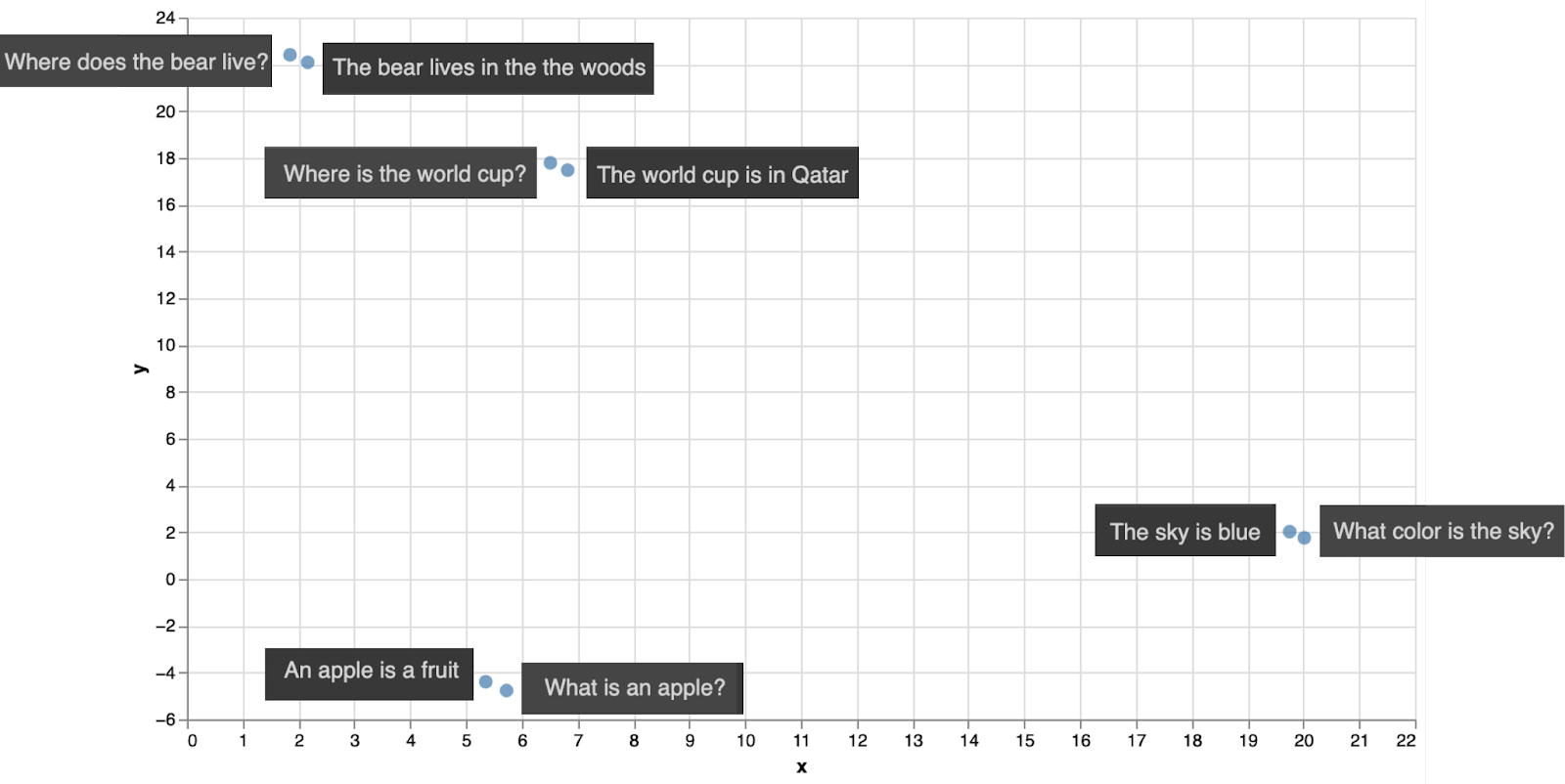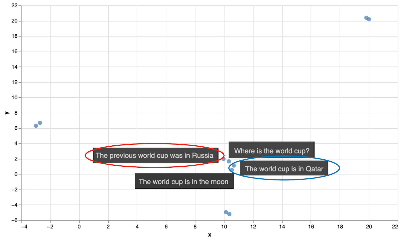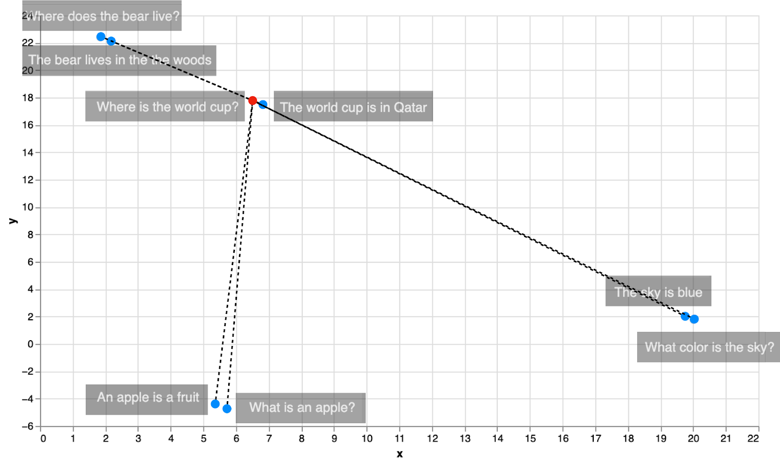 When we locate them in the embedding above, they are all close, as expected. However, the closest sentence to the query is not response 1 (the correct answer), but response 3. This response (“The previous world cup is in Russia”) is a correct statement, and semantically close to the question, but it’s not the answer to the question. Response 2 (“The world cup is in the moon”) is a completely wrong answer, but also semantically close to the query. As you can see in the embedding, it’s dangerously close to the query, meaning it is likely that bogus answers like these will be the top results in the semantic search model.