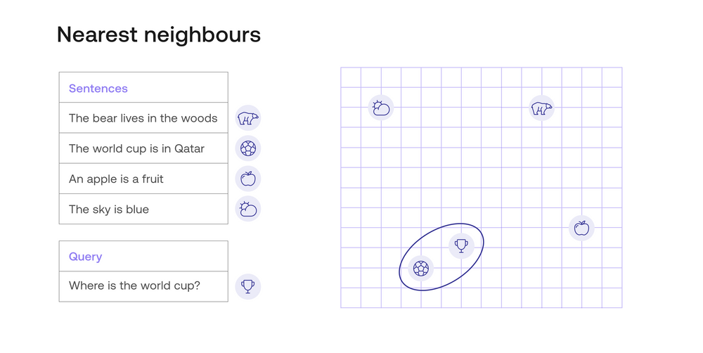 In this image, all the sentences are located as points in the plane. Visually, you can identify that the query (represented by the trophy) is closest to the response “The world cup is in Qatar”, represented by the soccer ball. The other queries (represented by a cloud, a bear, and an apple) are much farther. Thus, semantic search would return the response “The world cup is in Qatar”, which is the correct response.