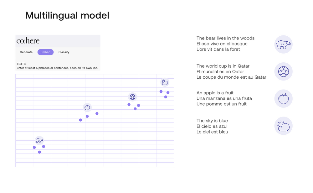 In the image below, you can see an example of multilingual embedding. The embedding sends each sentence to a vector of length 4096, but, just like in the previous example, a projection is used to send this vector to one of length 2. These 2 entries in the vector are used as coordinates in the plane for the plot.