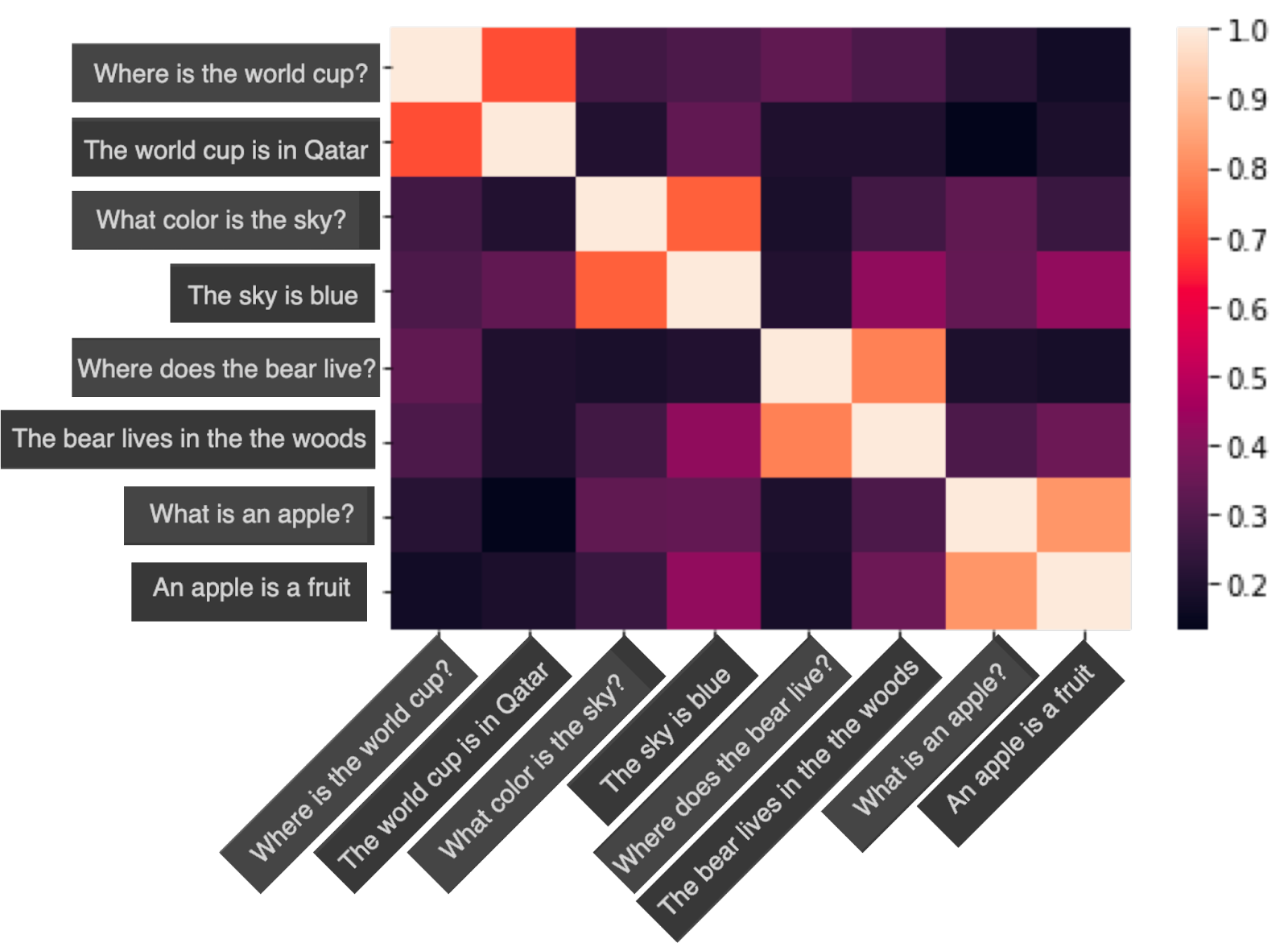 Now, in order to perform semantic search, all you have to do is calculate the similarity between the query and every pair of sentences, and return the sentence with the highest similarity. Let’s do an example. Below is a plot of the cosine similarities between the 8 sentences in the above dataset.