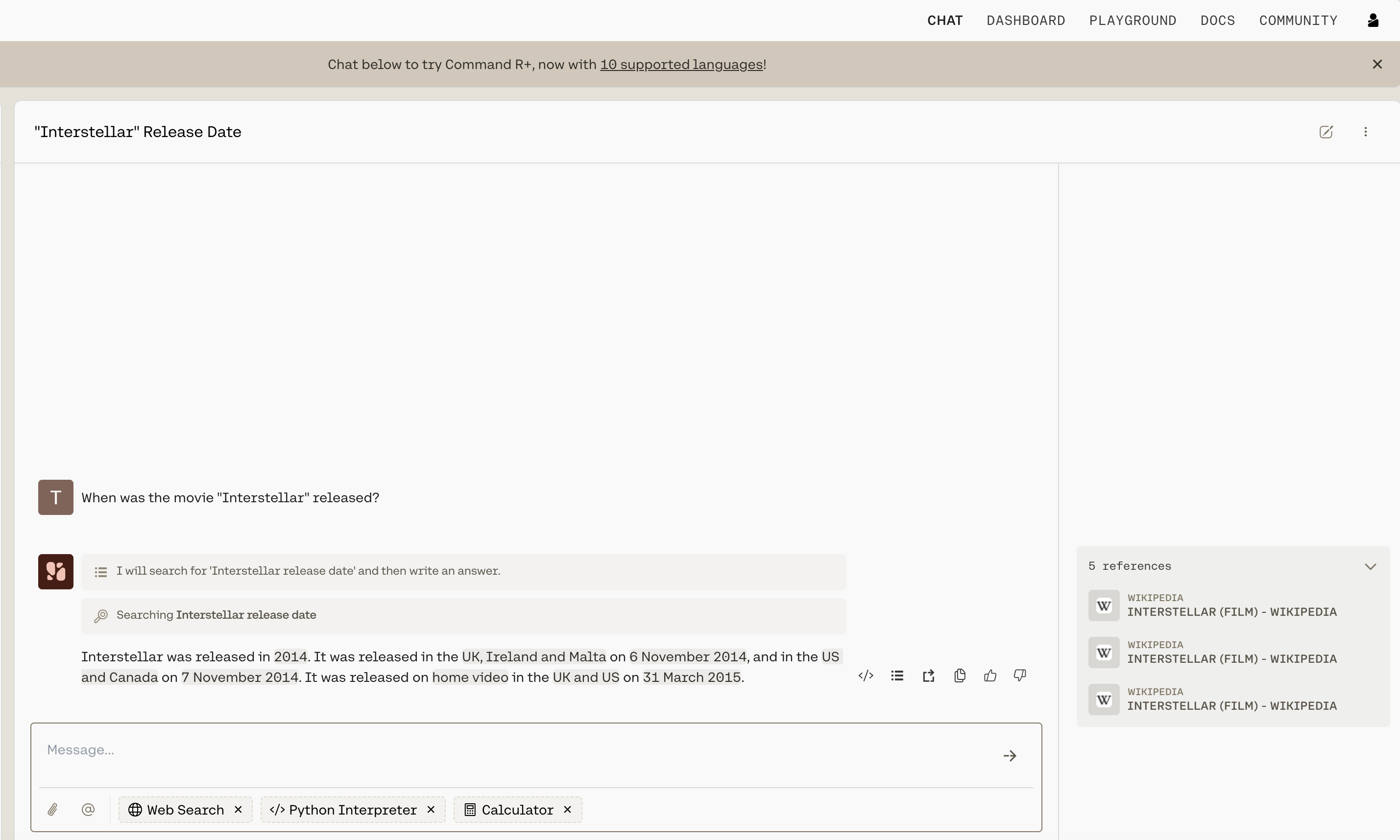 What’s more, advanced RAG capabilities allow you to see what underlying query the model generates when completing its tasks, and its output includes citations pointing you to where it found the information it uses. Both the query and the citations can be leveraged alongside the Cohere Embed and Rerank models to build a remarkably powerful RAG system, such as the one found in this guide.