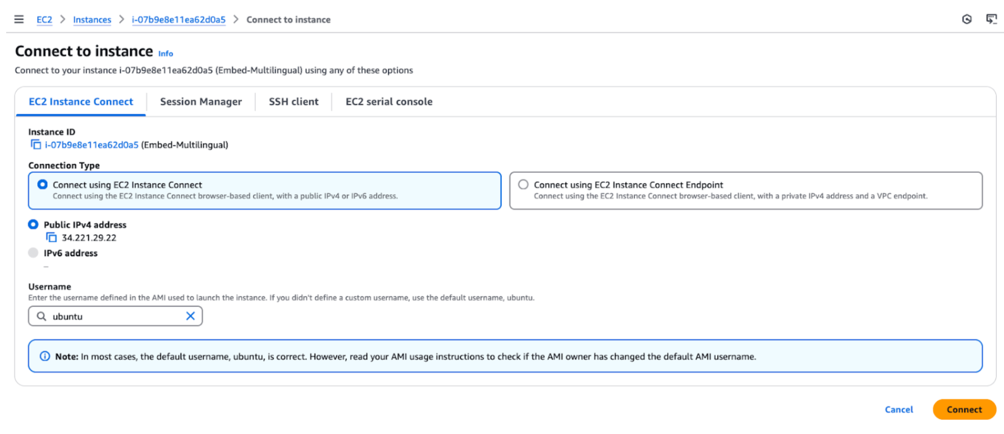 Next, connect to your EC2 instance using the “EC2 Instance Connect” option. This allows you to access the instance through a browser-based client using the default username “ubuntu.” Ensure your instance has a public IPv4 address for successful connection.