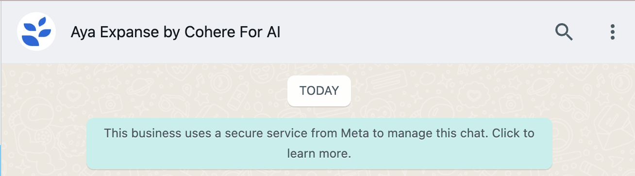 By communicating with Aya Expanse through WhatsApp, you agree to Cohere’s Terms of Use and Privacy Policy. Large Language Models might hallucinate, so be sure to verify important information.