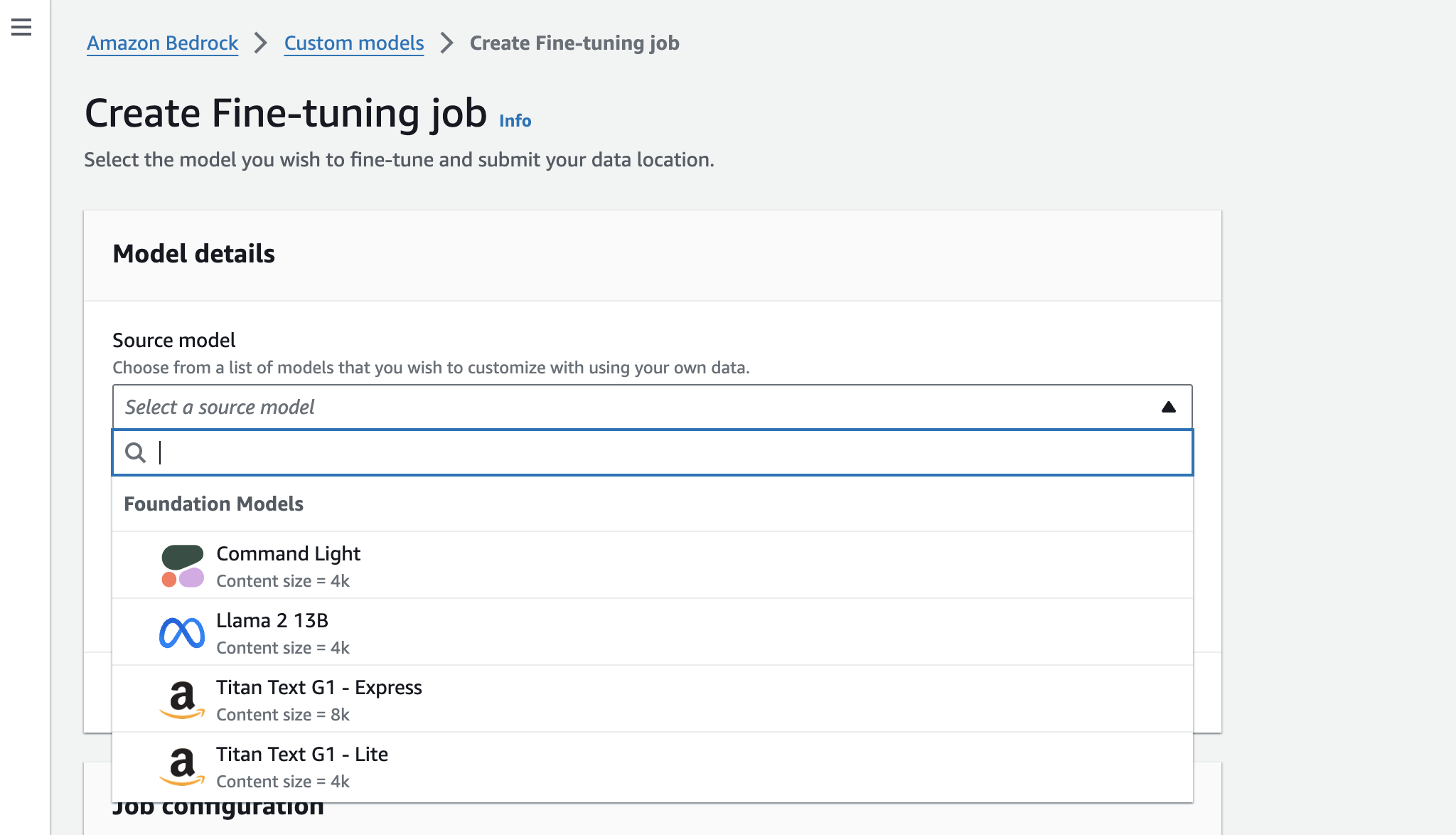 Creating a fine-tuned model for Generate via the AWS Console consists of a few simple steps, discussed below.