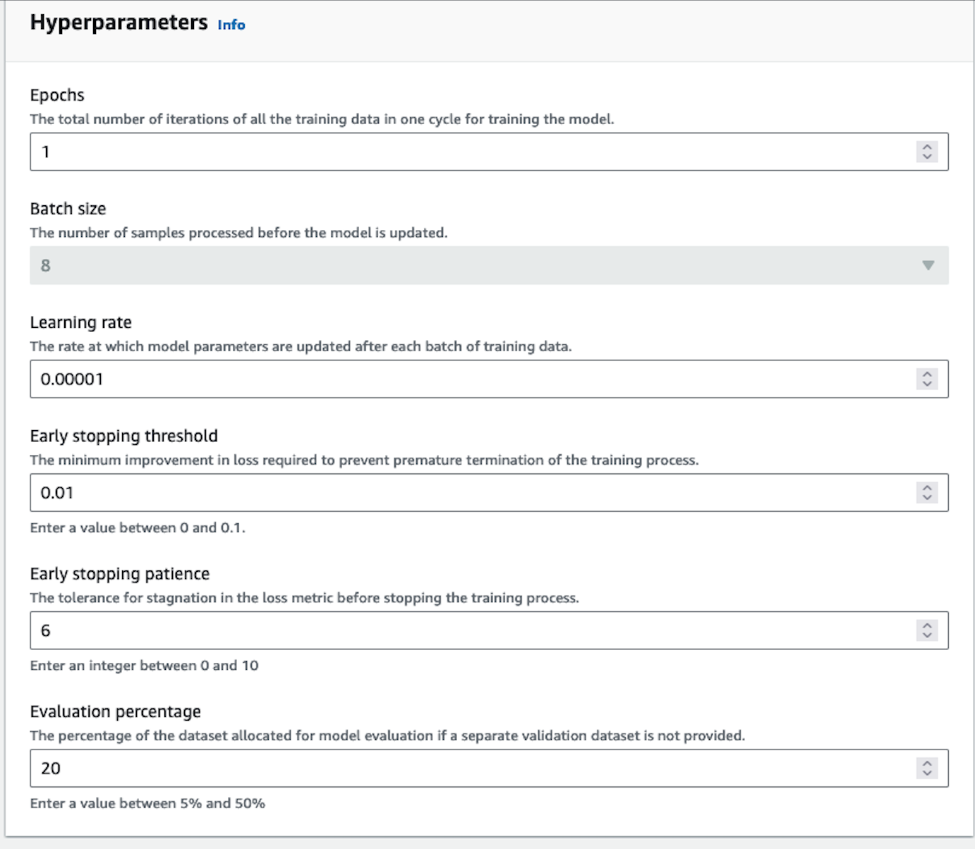 In the Input your data section, you can provide the S3 link to the training dataset file and, optionally, the validation dataset file. Your data should be in jsonl format. You can also set the following hyperparameters to use in training.