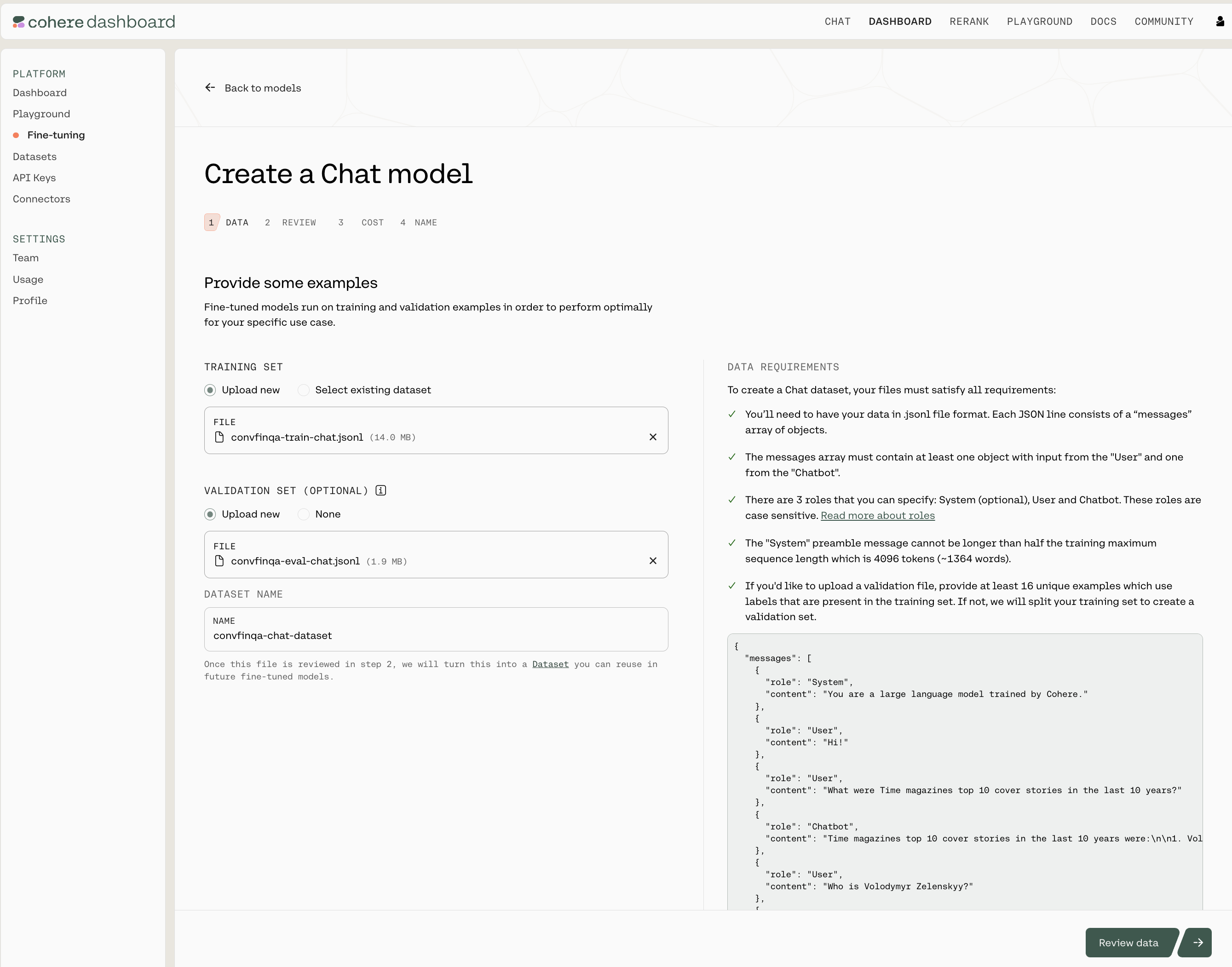 After uploading the dataset and going through the validation and review data phases in the UI, the fine-tuning job can begin. Read more about starting the fine-tuning jobs for Chat, Classify, and Rerank.